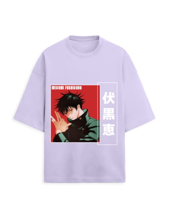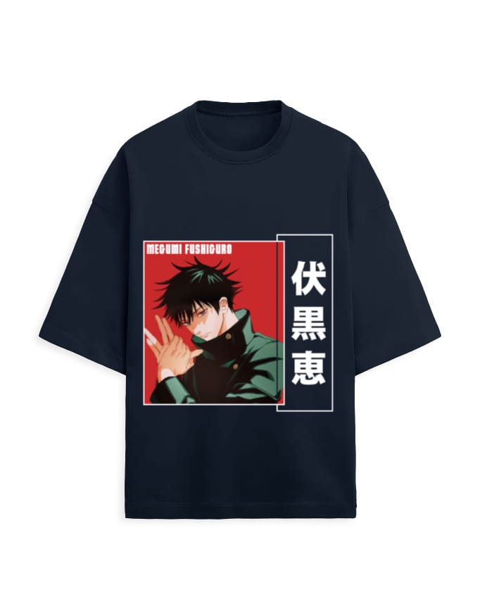 Design: Printed oversized tee with Jujutsu Kaisen Megumi Fushiguro artwork for a bold statement
